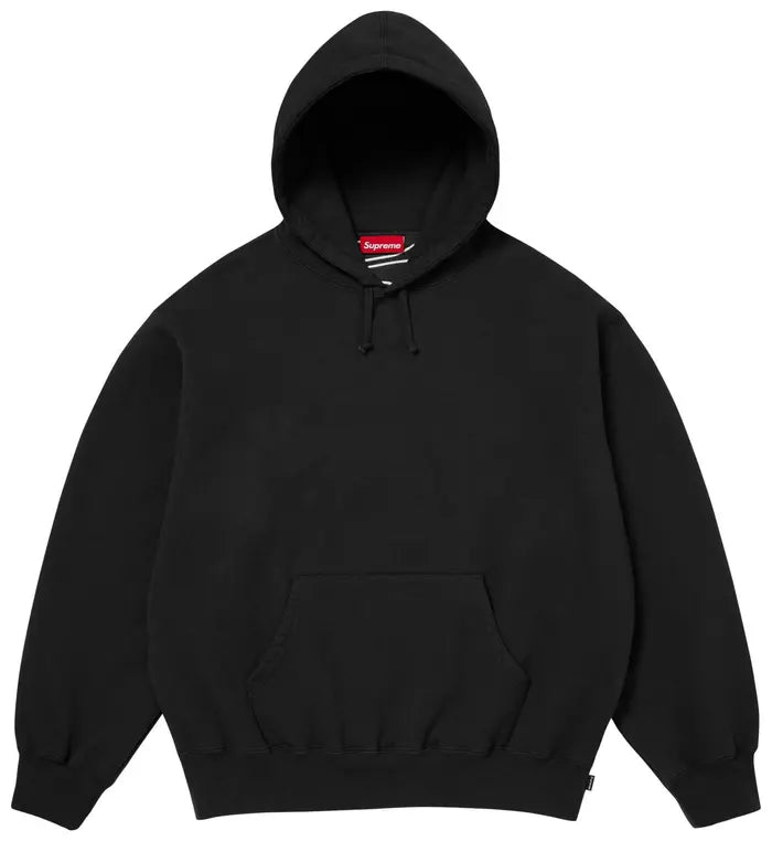 La Supreme Satin Appliqué Hooded Sweatshirt “Black” presenta un diseño sobrio con un toque distintivo, ideal para un look urbano y casual 🏙️.
